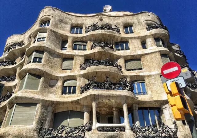 从圣家堂出来,沿着对角线大街向西,很快就能看到米拉之家(Casa Mila)。这是高迪设计的最后一个私人住宅,建筑全部是曲线和波浪形。正面有巨大的窗户和铁质阳台。屋顶的平台上是造型迥异、雕刻精美的通风塔。