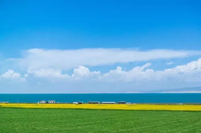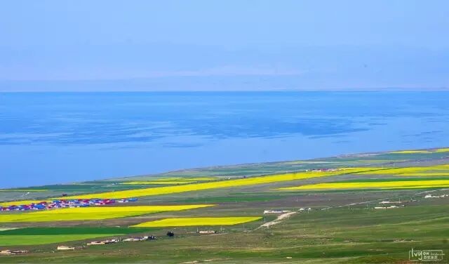 湖畔大片整齐如画的农田麦浪翻滚,菜花泛金,芳香四溢;那碧波万顷,水天一色的青海湖,好似一泓玻璃琼浆在轻轻荡漾。