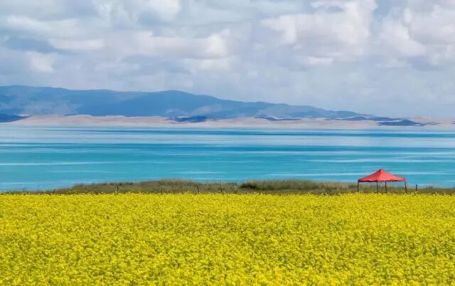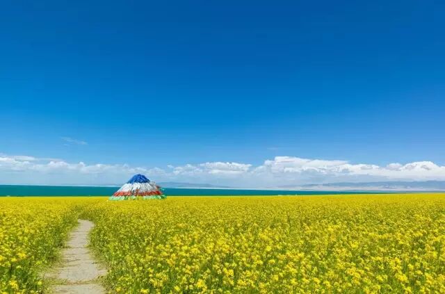 7、8月青海湖最美之时,环湖千亩油菜花竞相绽放,碧波万顷的湛蓝外围散布着金灿灿的亮黄,高山牧场的野花五彩缤纷,如绸似锦,数不尽的牛羊膘肥体壮,点缀其间。