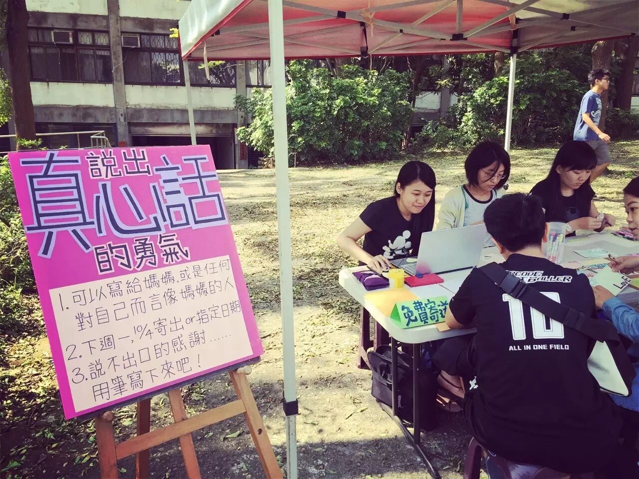 沿途还可以看见社团活动,有个《让爱无碍——妈,我永远需要您》的活动。旁边的看板上写着: