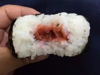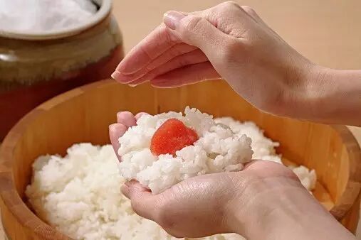 传统的日本饭团是三角状。饭团中裹上一颗腌制的酸梅(超酸无比),外面裹上一片干海苔包裹,携带十分方便。做饭团有很大的讲究,在捏的时候手上需沾些盐,饭团与寿司相比感觉更平民化
