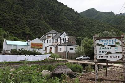 上山的缓坡拐个弯,就可以看到一片青灰色的仿古村落。错落分布的二层小别墅背靠着连绵的青山,可以清楚地看到远处山间蜿蜒而上的长城。村落对面就是绿水流觞,街边墙下开满了紫色的鸢尾。
