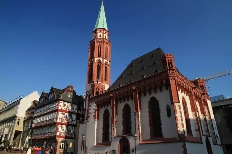 广场的东侧则有一排古色古香的半木造市民住宅。另有帝国大教堂(Kaiserdom),罗马厅(Romer),还有圣尼古拉旧教堂(Nicolai Kirche)等。帝国大教堂建于1239年,有着哥特式的华美外表。它不仅是法兰克福的精神中心,还曾是德国国王的加冕之地。在1562-1797年间,共有10位皇帝在此举行了加冕典礼。