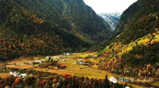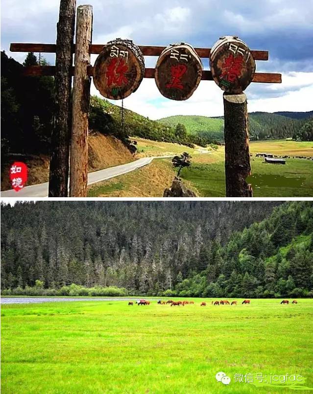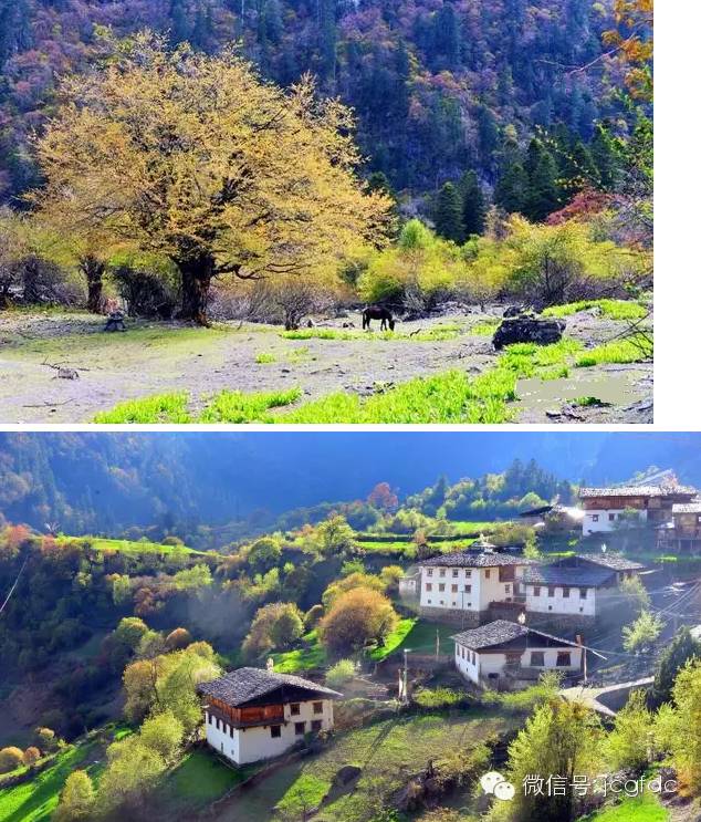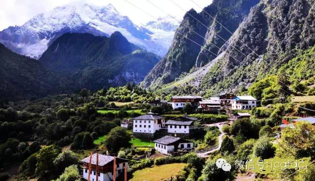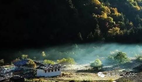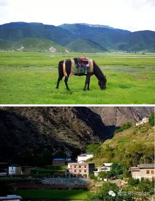 古老的藏族民居坐落在山脚下,低矮的藏房,站立的青稞架,四围是绿茵茵的草甸围绕,田园风光清新可人。早晚,在一片柔和的光线中,炊烟袅袅升起,诠释出了“不知人间愁滋味”的完美意境。人与自然和谐共生的绝美画卷就那样徐徐展现在世人眼前。