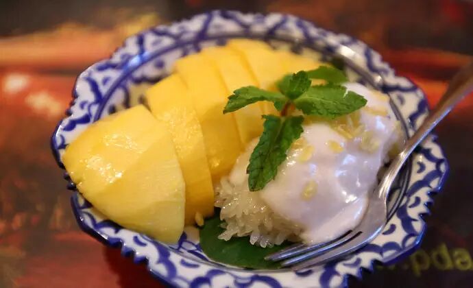 芒果糯米饭是泰国经典的甜主食。芒果和糯米饭要一起进嘴才能起最魔幻的化学反应。芒果甜中带酸,这酸味与裹上了泡浸香浓椰浆的泰国香糯米饭的甜味混合,美妙无比。