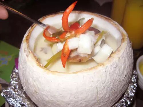 泰式椰汁鸡汤可谓是曼谷名汤,已有数百年的历史。因为椰奶带甜味,又比较油腻,所以一般在泰国菜中,椰奶多用作咖喱菜肴之调味或调色,极少作烹汤用。