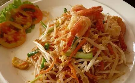 泰式炒面以泰国河粉加上香料、肉类、蔬菜、鸡蛋等材料同炒而成,食用前可以依据自己的口味挤半个酸橙在面上,味道酸爽可口。