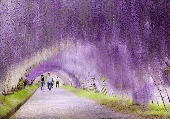 紫藤隧道位于日本北九州港市的河内富士山公园中,从图中可以清晰的看到它美丽的景色,仿佛置身于童话王国一般浪漫与多彩。各种颜色的花朵与藤蔓点缀于棚顶,把这个隧道衬托的格外美丽与神秘。