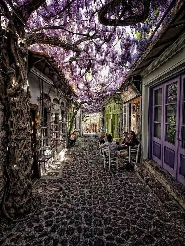 按照神话的说法,太阳神之子---马卡拉斯移居到了莱斯沃斯岛。在这里,到处都是美景,随处都可以看到色彩碰撞出的惊喜!莱斯沃斯岛是希腊最美的小镇,这里一到春天就会开满安静的紫藤花……白色的房屋,紫色的花朵,十分浪漫迷人。
