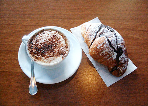 一个我认为早餐不很大份儿的国家。没准儿他们是在为大大的干酪披萨午餐和香葱起司意面晚餐节省胃空间呢。(尽管我们知道吃这些并没有什么不对)不管怎样,这份意式早餐只有卡布奇诺咖啡和羊角面包。