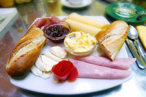 嗯~~~非常美味的早餐,有肉,奶酪和面包,就是最常见的搭配了。精巧制作的类似玫瑰花物可选。