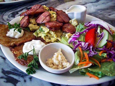 当地人称为Jajecznica,这种传统的波兰早餐包括覆盖有客人自己选择的波兰熏肠切片的炒鸡蛋,同时搭配有两个土豆煎饼。