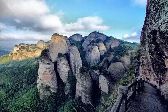 登上栈道,在悬崖峭壁间领略奇山奇石的奇秀风光。栈道从古树掩映的贵妃谷开始,穿过了湿润阴凉的峭壁山林,眼前豁然开阔,半米多宽的栈道弯弯曲曲地悬挂在陡峭的石壁间,头顶是峭壁,脚下是悬崖。胆小者勿入!