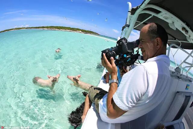 这群访客坐着游船,看到游泳的猪,他们当时就震惊了!他们的第一反应当然是拿出自拍杆,拍下和猪一起游泳的合影,分享朋友圈。