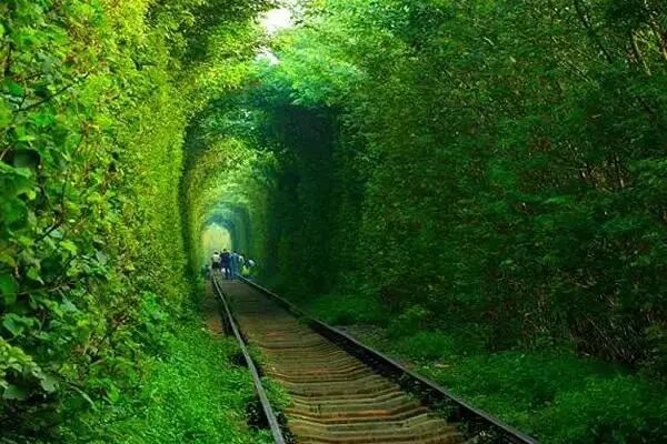 南京江宁有一段数百米铁路,铁路两旁绿树成荫,繁茂的枝蔓绿叶由于来往火车削磨,形成了浑然天成的绿色隧道。幽静的环境、美丽的景色,让它有了“爱情隧道”的美名。不少情侣,文艺青年慕名而来。