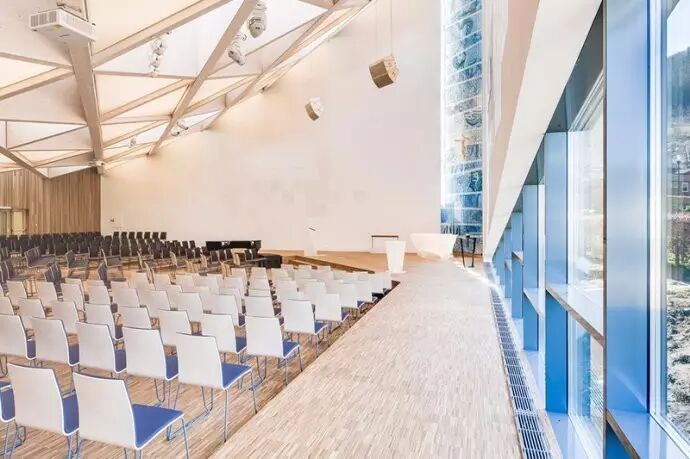 明亮温暖的阳光由礼堂正面照入,婚礼时,教堂内会传来竖琴和管风琴的悦耳琴声。