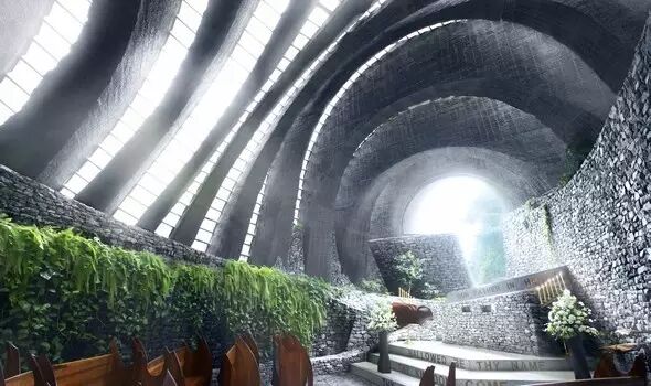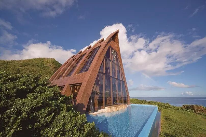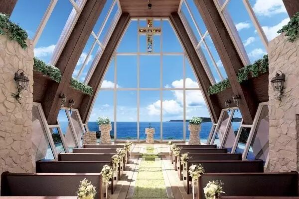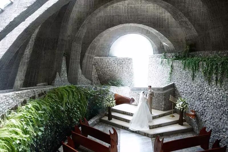 仪式开始时,新人将走过象征“诞生开始”的蛋形入口,走在由1万束玫瑰铺满的玻璃走道上,通向树、石和玻璃做成的温暖空间。教堂的圣坛是仿关岛古迹拉提石的造型,充满了当地风情。
