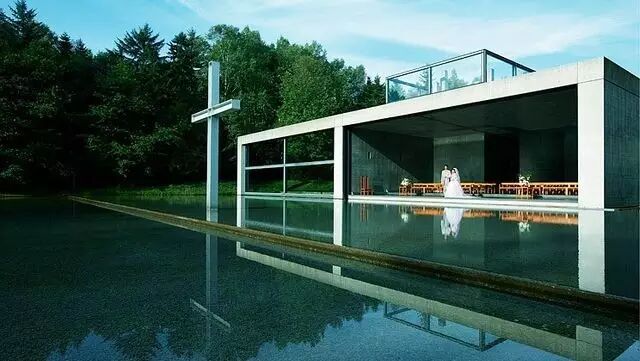 水之教堂以“与自然共生”为主题,教堂的正面由一面长 15 米,高 5 米的巨大玻璃组成,每年 5 月到 11 月间,巨大的玻璃将完全打开,使教堂与大自然混为一体。