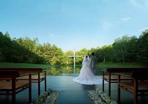 婚礼仪式犹如在北海道的壮观大自然中举行,一片平静的水面上,静静矗立着宁静庄严的十字架,周围的白桦林,北海道的蓝天白云都倒映在湖面上,新人们感受着北海道的清风,听着湖水的潺潺声,远处更是传来小鸟的歌唱声,犹如大自然送来的赞美歌祝福着新人。
