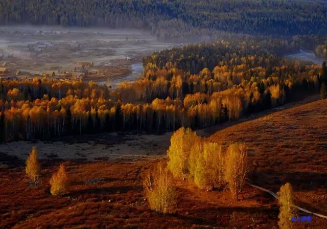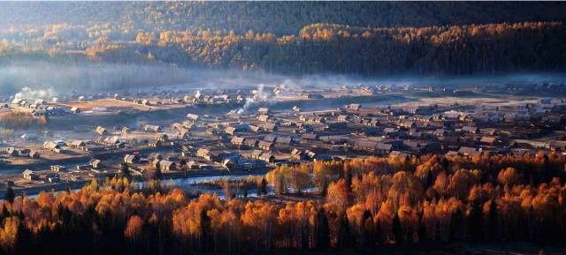 秋天的图瓦村,无论从任何一个位置任何一个角度放眼所望,都是热烈而明朗的金黄色,漫山流丹溢彩白桦林,小河、木房、炊烟、桦林及骑在马上三五成队的游客,汇集成一幅优美的风景画。