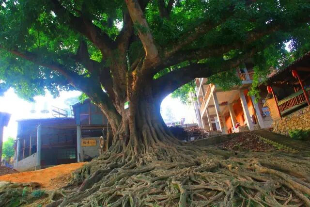 坝美村寨子古老而优美,高大的榕树枝繁叶茂,巨型的树根盘根据错节裸露在地面上。一层层依山而建木楼里居住着百多户壮族人家。