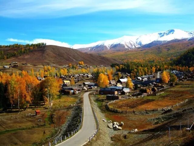 山村的西北遥对中国与哈萨克斯坦国界河,南面是高山密林。秋季一到,山村是五彩的红、黄、绿、褐色,层林尽染,犹如一块调色板,加之映衬阿勒泰山的皑皑雪峰,一年四季都是一幅完美的油画。