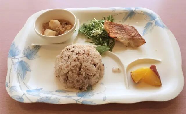 如果想要来这里用餐的话,要现在东京都政府大厅的1楼或者2楼办理手续,获得临时通行证才能进入。图中的饭菜荤素搭配,有米有面还有汤,营养均衡。