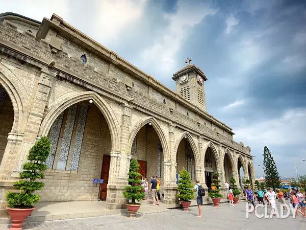 2. 芽庄教堂 芽庄教堂是一座哥特式建筑,建于1928-1933年,与《巴黎圣母院》里的教堂相比,当然要逊色不少,不过也很有法国味,教堂有钟塔和美如锦花、绘满《圣经》故事的天窗玻璃,石头建造的内部墙壁给人清凉之意。 与大叻粉色教堂、胡志明红教堂不一样的是,芽庄教堂是纯粹的石头颜色,没有任何缤纷的颜色装饰却显得很雄伟大气。 教堂外是繁杂吵嚷的街头,教堂内则静谧平和,俨然另一个世界。教堂每天早晚举行弥撒活动。常能在门外听见诵经声或唱诗班美如天籁的歌声。 教堂周围地势较高,可以一览整个芽庄。 3. 婆那加占婆塔 婆那加占婆塔(Po Nagar Cham Towers),也译作天依女神庙,因为这里供奉的是天依女神(Po Nagar)——庇佑占婆王国南部的一位女神。她保护着靠海吃饭的渔民,相当于中国渔民心目中的妈祖。 此塔建于公元7-12世纪间,是印度教代表的建筑,略有些吴哥窟的风格,但是规模小的多,正座寺庙目前仅存5座建筑物,雕刻也没有那么的细致。 不过据说早在公元前二世纪,印度教就在这里供奉印度教希瓦神(Siva)了。现在来这里参拜的,不仅有越南人,也有当地的很多华人,进门的时候,别忘了脱鞋。 从位于小山上的占婆塔往下看,能看到芽庄碧蓝的海港。