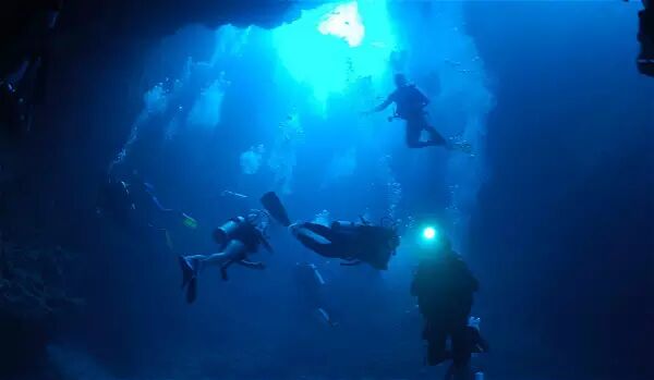 蓝洞位于 Rock islands 岩石群岛的西侧,洞穴、悬壁、各种回游性鱼类是此地的特色。蓝洞是拜访帛琉不可或缺的潜点;它是一个多孔的入口,从水底约3公尺深处有4个入孔通入蓝洞, 光线从4个洞射入反射蓝光,形成神秘美丽的景像。底部的窟洞非常的宽阔,约在20公尺处有一横洞通往外界的悬壁。横洞的四周布满了许多柳珊瑚,出了横洞可 看见大型的回游鱼类。