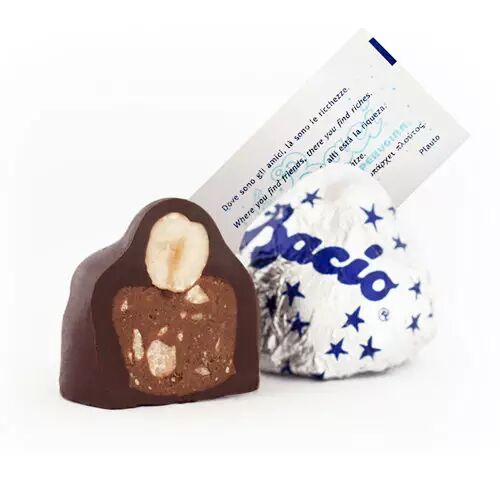 BACI是意大利语“吻”这个词的复数。Baci巧克力是由里面的纯巧克力和一个果仁组成。形状很可人,味道纯正浓郁,外面包装以蓝色星星图案主打,十分抢眼。每颗巧克力都附着一张写有意法西英德语的爱的箴言。