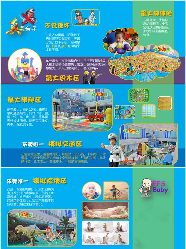 有126个亲子项目,11大娱乐分区!东莞最大的波波池,最大的积木区,激发孩子想象力!有高达10米的最大攀爬区等他(她)来爬个够!想体验各种角色?模拟交通区、模拟险境区,激发孩子创造力和应变能力!