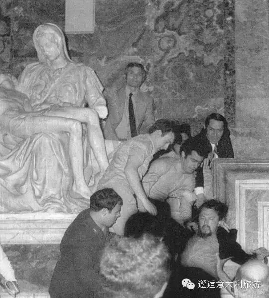 雕塑前面有一道防弹玻璃。最初是没有的,1972年有个疯子带着把地质锤就进来了(那时候没什么安保措施),看了几眼雕塑,就冲上去啪啪啪狠砸了15下,边砸边喊“我是基督!我复活了!” 大家都吓傻了,等围观群众把他制服后,才发现圣母的左前臂已经掉下来了,鼻子掉了一块,眼皮划掉了一片,真的“伤”了。