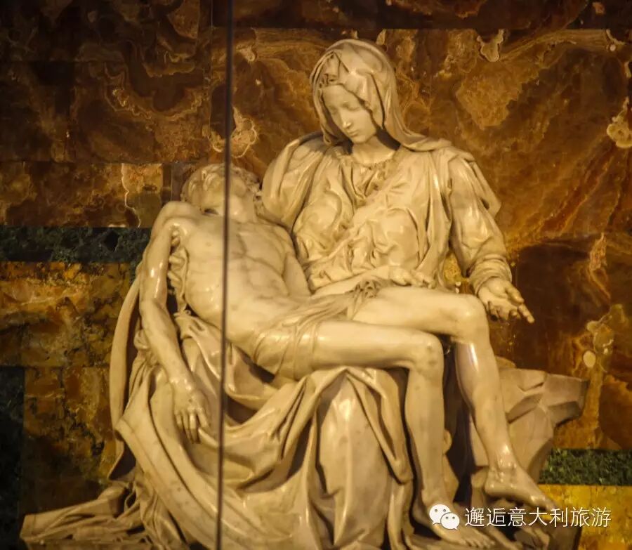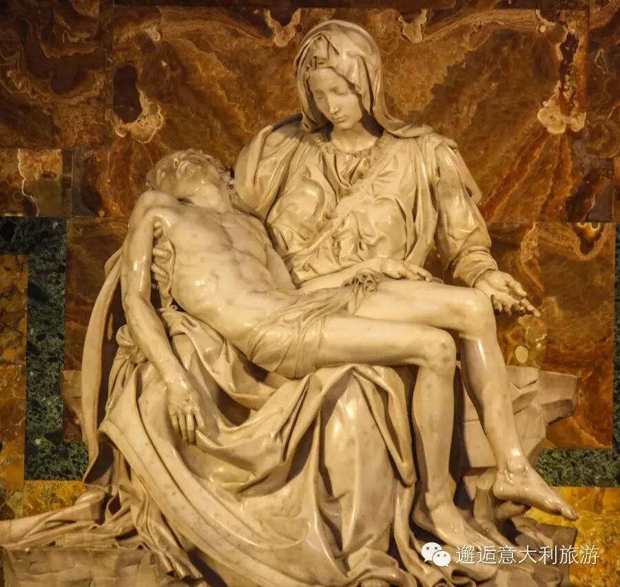 在通常的作品中,圣母的形象是一位中年妇女。但是米开朗基罗是奇才啊,不走寻常路是他的强项。这尊大理石作品中,他把圣母刻画成少女,他的说法是“圣母玛利亚是纯洁、崇高的化身和神圣事物的象征,所以必然能够永远保持青春美丽的容颜。”其实谁都知道米大师爱美成痴(看《大卫》就知道),怎么美怎么来。圣母胸前衣带上刻有他的签名,这是米开朗琪罗唯一的一件署名作品。