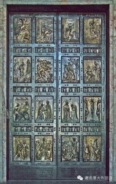 教堂有5扇巨大的门,各描绘了一个圣经故事,其中右边的一扇仅在25年一次的圣年(也叫禧年或大赦年)开启,让教众进入,豁免原罪和普天大赦。
