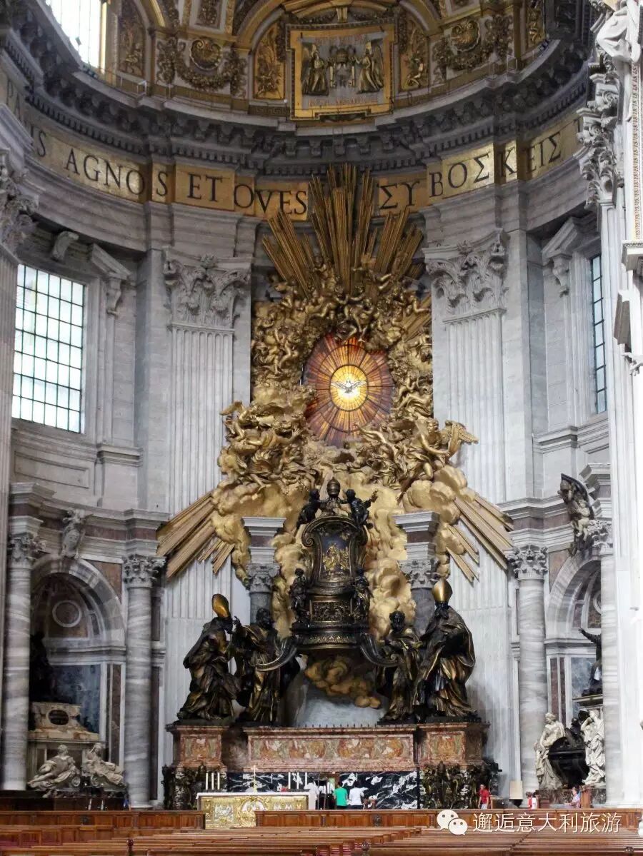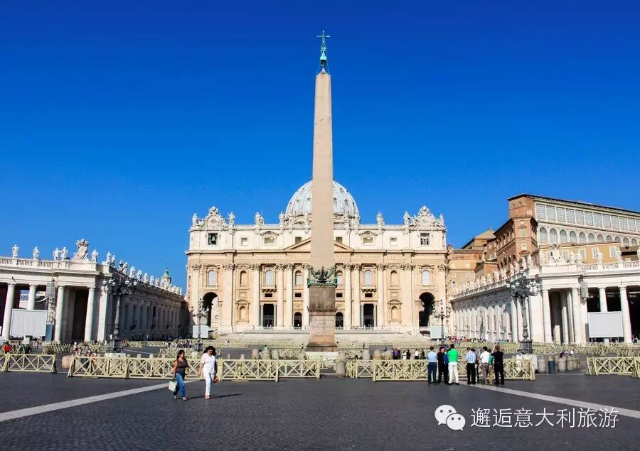 圣彼得大教堂所在的广场是大师贝尔尼尼为梵蒂冈建的,整个广场呈椭圆形,从高处看下去像是两条伸出去的手臂。可以容纳30万来自全世界的教众。