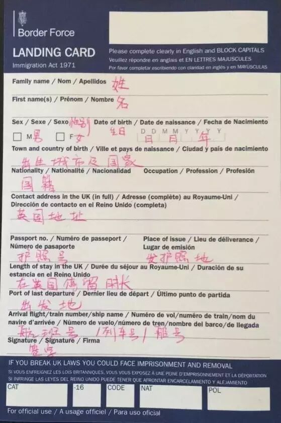 在飞机即将抵达英国时,空中服务人员一般会向您提供英国入境卡和海关申报书,也可在机场入关前柜台处免费领取。填写时请用英文大写字母,中英文对照入境卡请参考以下模版,对于信息不确认的内容请提前与旅行社联系咨询
