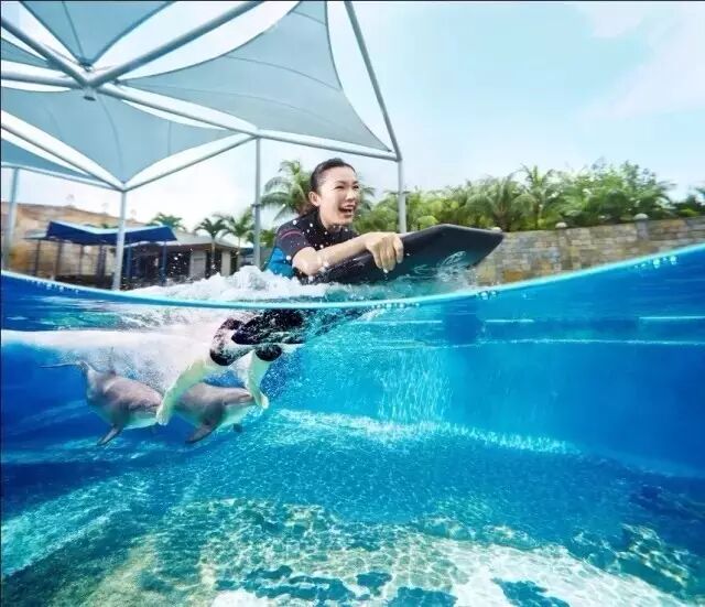 “海豚伴游”让你与海豚肌肤相亲,遨游同乐!俏皮海豚将在水中“推波助澜 ”,带你遨游深水,贴身伴游,享受一对一礼遇。