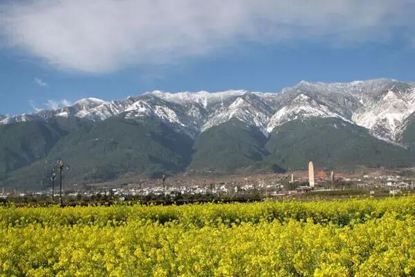 苍山,是云岭山脉南端的主峰,其间林壑深邃,蓊蓊郁郁,“不知生在翠微里,疑泛虚舟碧海中”。苍山以雪、云、泉、石著称,经夏不消的苍山雪,是大理“风花雪月”四大名景之最,远望苍山,皑皑白雪,雪色映天,十九峰巍峨于烟云缭绕间,恰似十九位玲珑的少女,披着绿装,半蒙轻纱,翩然起舞。