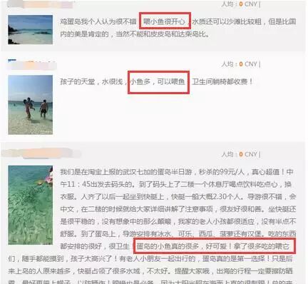 比如说搜索结果的第一篇文章就是对鸡蛋岛旅游的评论,文中提到“鸡蛋岛由三个小岛组成,有很多鱼,特意买了大袋的面包带过去”,以及“能喂鱼还是很受小朋友欢迎的”。