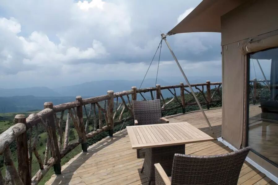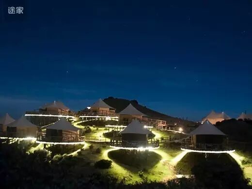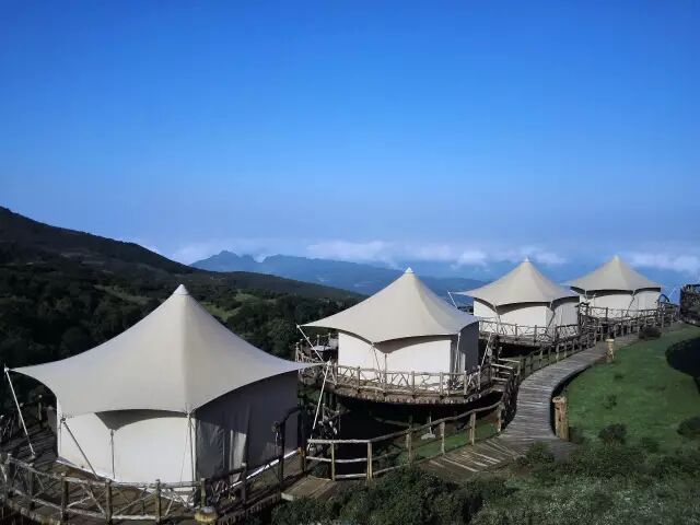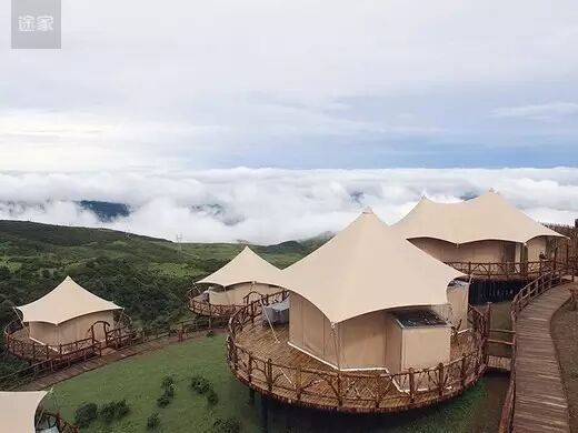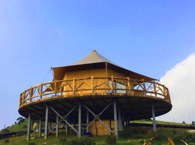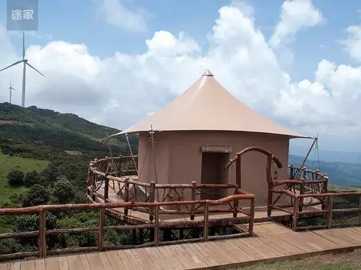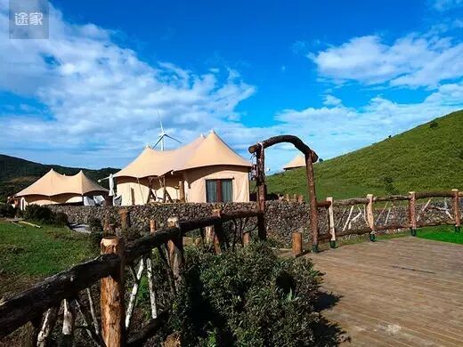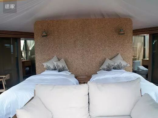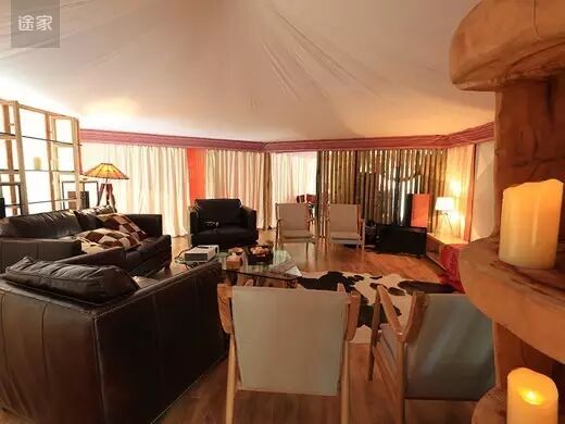 与传统营地不同的是,这里所有的房屋都是以布为墙,木为柱,绳扣为钉,所有家具器物均为木、石、皮革等极具旷野风格的材质,四周全玻璃框架还能让游客全方位的观赏周围美丽的自然景观。