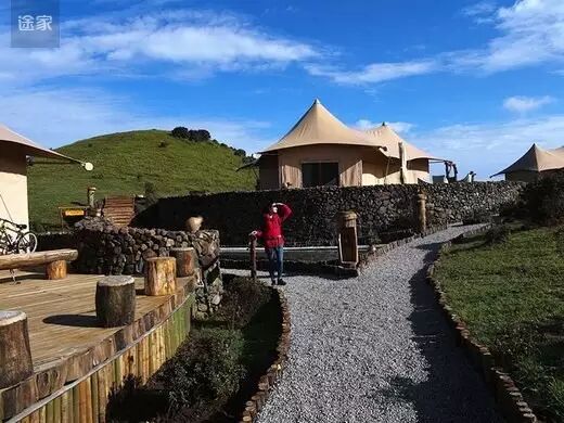 几簇帐篷悠悠地俯在草原上,简约却又不失雅致,棚顶绣满了蓝天白云,远处牧人的吆喝声隐约可见,石头酒吧有人唱着怀旧的老歌。