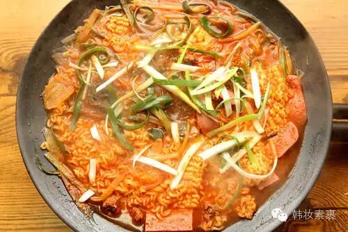 部队汤是一种将泡菜、蔬菜、午餐肉、脆皮肠等一起混煮的韩式火锅,热气腾腾、味道酸辣。发源于首尔近郊的“议政府”,是朝鲜战争后从美军部队流传下来的,因而得名。