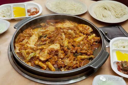 铁板鸡是将鸡肉和各种蔬菜一起放在铁板上翻炒,一般还可追加年糕、奶酪、粉丝等,味道辣中带甜,是江原道春川的特产。