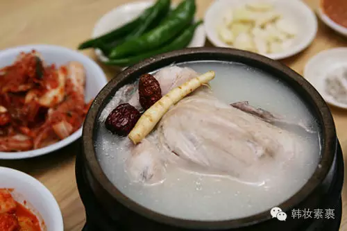 1人份是一整只童子鸡哦!童子鸡的腹中塞满糯米、大枣、板栗及大名鼎鼎的高丽人参等,经长时间炖煮而成。鸡肉软嫩滑爽,鸡汤鲜香味浓郁,散发着浓浓的人参味。有些店铺还使用各种韩方药材炖出味道独特、更加滋补的参鸡汤。