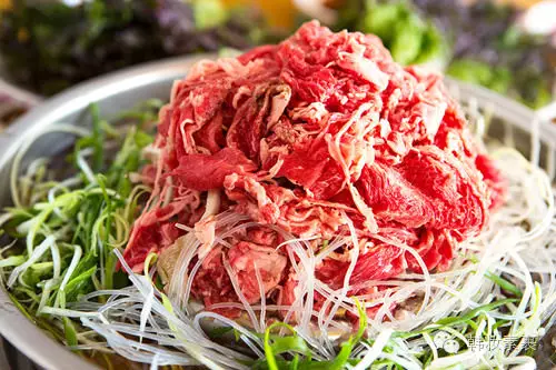 调味牛肉也是相当有韩国特色的一道料理。牛肉经特制的酱汁调味过,与蔬菜、蘑菇、粉条等一起堆放在扁平的敞口锅上炒煮。薄薄的牛肉肉质不用说,味道甜甜的鲜鲜的,是韩国人喜爱的那种独特味道。
