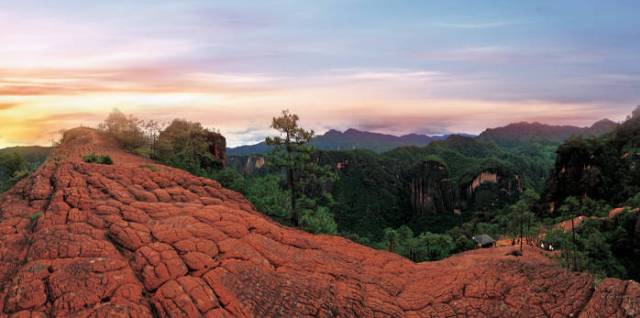 黎明位于老君山景区,面积300平方公里,有240平方公里山岭峰峦呈现着十分惹眼的丹红色景致。
