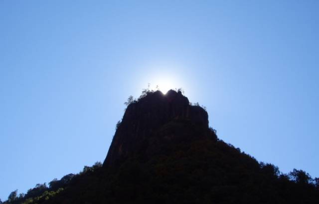 怎么会有如此奇异之事?这得得益于当地的特殊地理位置,在黎明街的北端,向东边望去可以见看见三座异形的山峰,而且一座比一座高出一大截,所以,每天早晨的八点半左右,太阳会从第一座山峰后腰升起,缓缓爬升,大概要半个小时的时间就隐入第二座山峰后了,感觉刚要迎接日出转眼间又不在了。过一会儿,太阳从第二座山峰左侧升起,半个小时以后又隐入山峰后,再过半个小时太阳就从第三座山峰右侧上部升起。这个地方真如它的名字黎明一样,特别神奇。