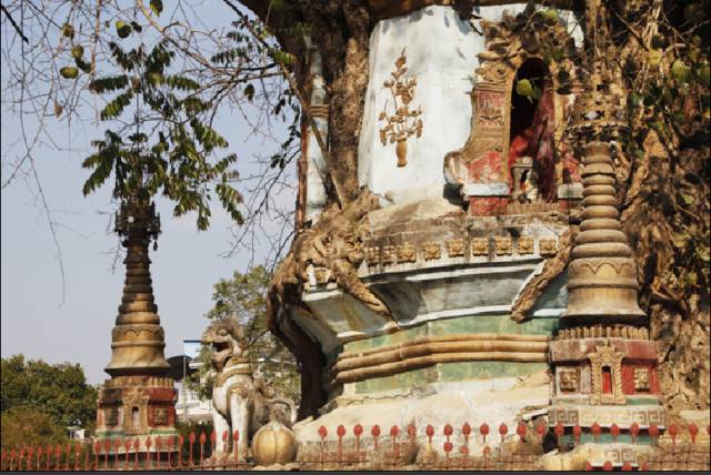 芒市的树包塔塔高10余米,树高数十米,塔顶着树,树包着塔,顶上枝叶葱茏,脚下佛塔生辉,堪称塔中绝景。