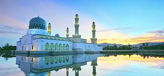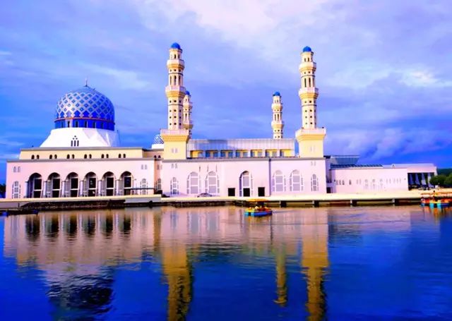 这是马来西亚夕阳景观最壮丽的清真寺之一,也是沙巴的代表建筑之一,属于典型的伊斯兰教风格。当夕阳映衬在这座白墙蓝顶的建筑物上,犹如漂浮在里卡士湾的人造湖上一般,随手一拍就是最美的明信片。