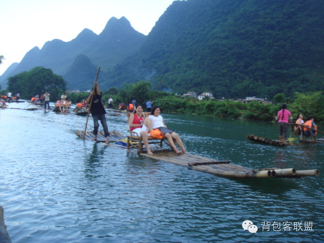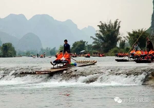 遇龙河漂流绝对算得上是小家碧玉。 这一次是真正的竹筏,而且是师傅自己撑杆的,来回大约1个小时。 遇龙河的水很干净呀,据说可以直接捧起来就喝! 途中会经过两个小水坝,会捡起很大的水花~要保护好相机!当然,在旁边还有给你照相的,你可以到岸上去选照片,20元/张,你买一张撑杆的师傅就获得1个积分。